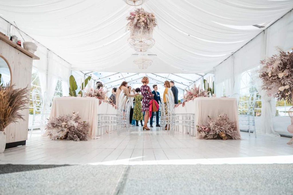 Dodatkową zaletą podłogi jest brak widocznych śladów łączeń poszczególnych modułów podłogi w postaci metalowych łączników – gotowa podłoga stanowi jednolitą całość, stworzoną wyłącznie z białych desek. Wspaniale komponuje się z bielą namiotu, stołów i krzeseł a także ozdób dodatkowych.