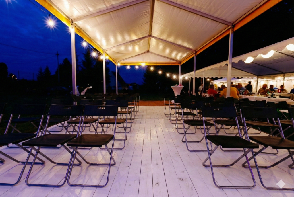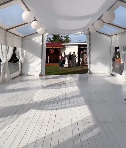 Biała drewniana podłoga jest wspaniałym uzupełnieniem namiotu na Twojej imprezie.